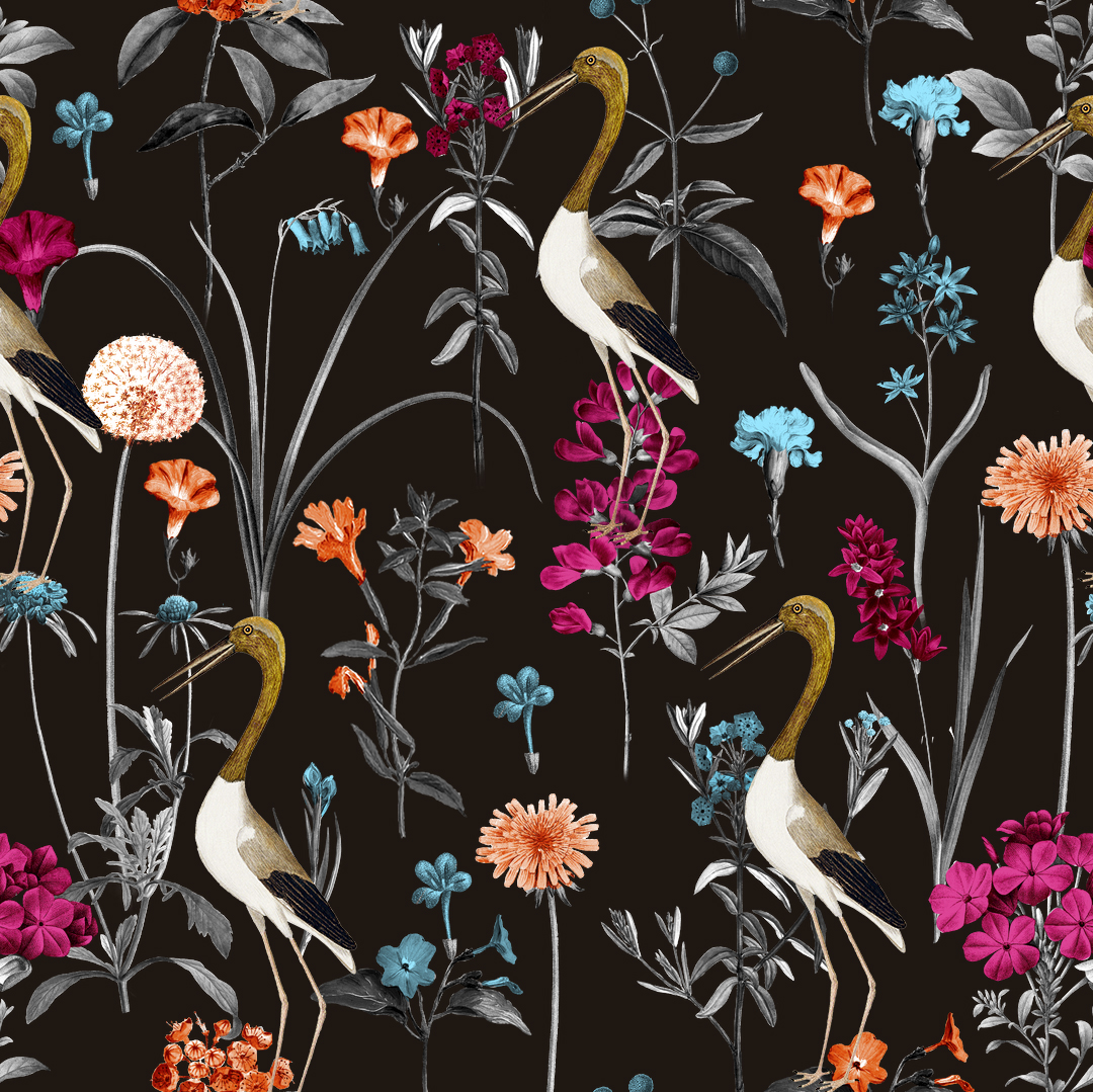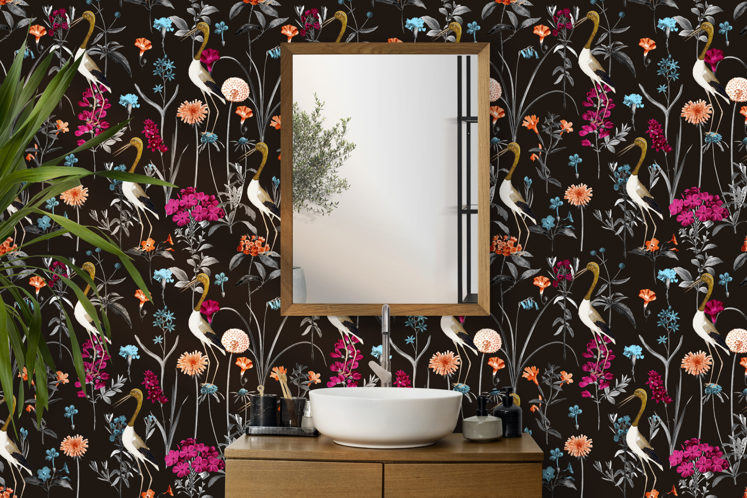 The wallpaper depicted in the image is a stunning example of how nature-inspired motifs can be transformed into a sophisticated and modern design. This wallpaper features a combination of botanical elements and wading birds set against a deep, dark background, creating a striking contrast that is both elegant and visually captivating. The design evokes a sense of mystery and allure, making it a perfect choice for those looking to add a touch of drama and sophistication to their interiors.